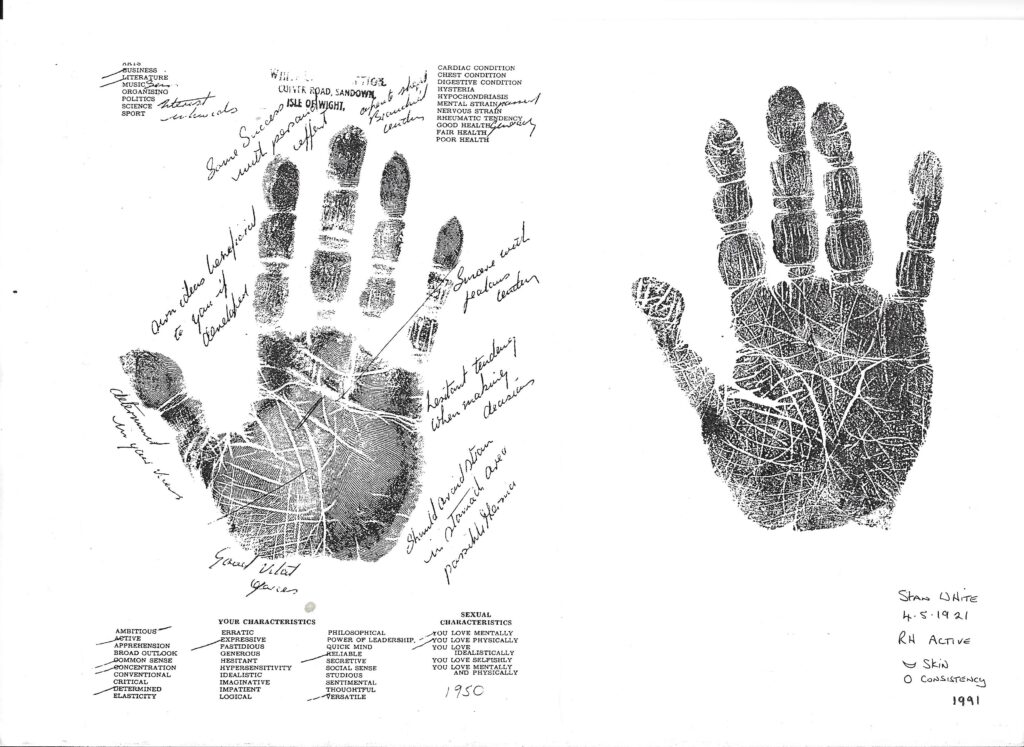 Ageing : As a general observation, the number of lines on the hands tend to increase with age. The handprints below were taken in 1950 aged 29 and again in 1991 when the owner was 70. The changes associated with ageing can be clearly seen in these hands and it is easy to see the increased lineation on the ball of the thumb and on the finger phalanges in particular.